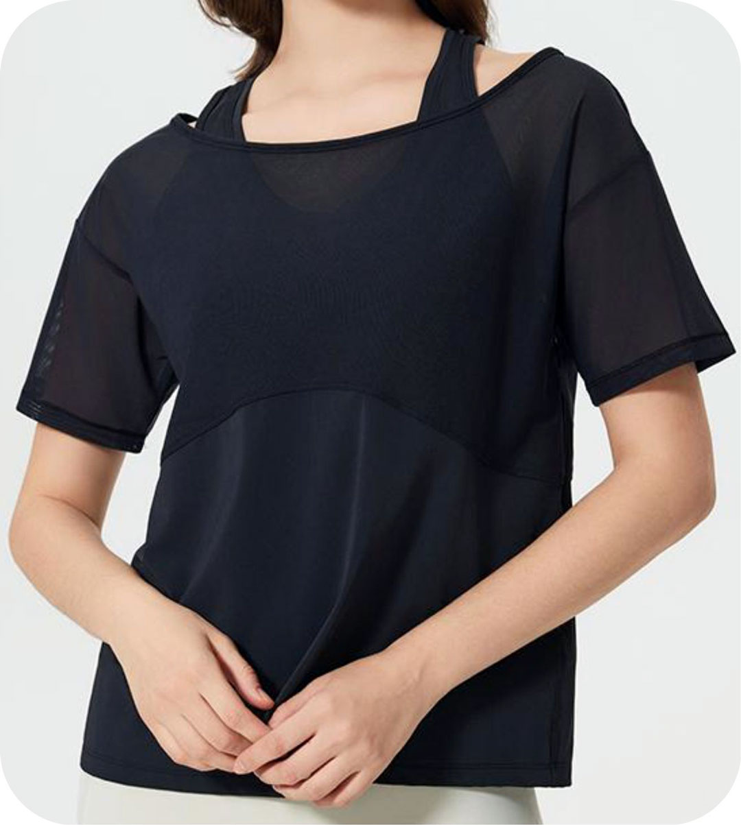 Blusa com design moderno e recorte em tule que revela delicadamente os ombros. Modelagem soltinha e confortável, confeccionada em tecido leve e respirável. Sofisticada e versátil, ideal para treinos ou looks casuais com elegância.